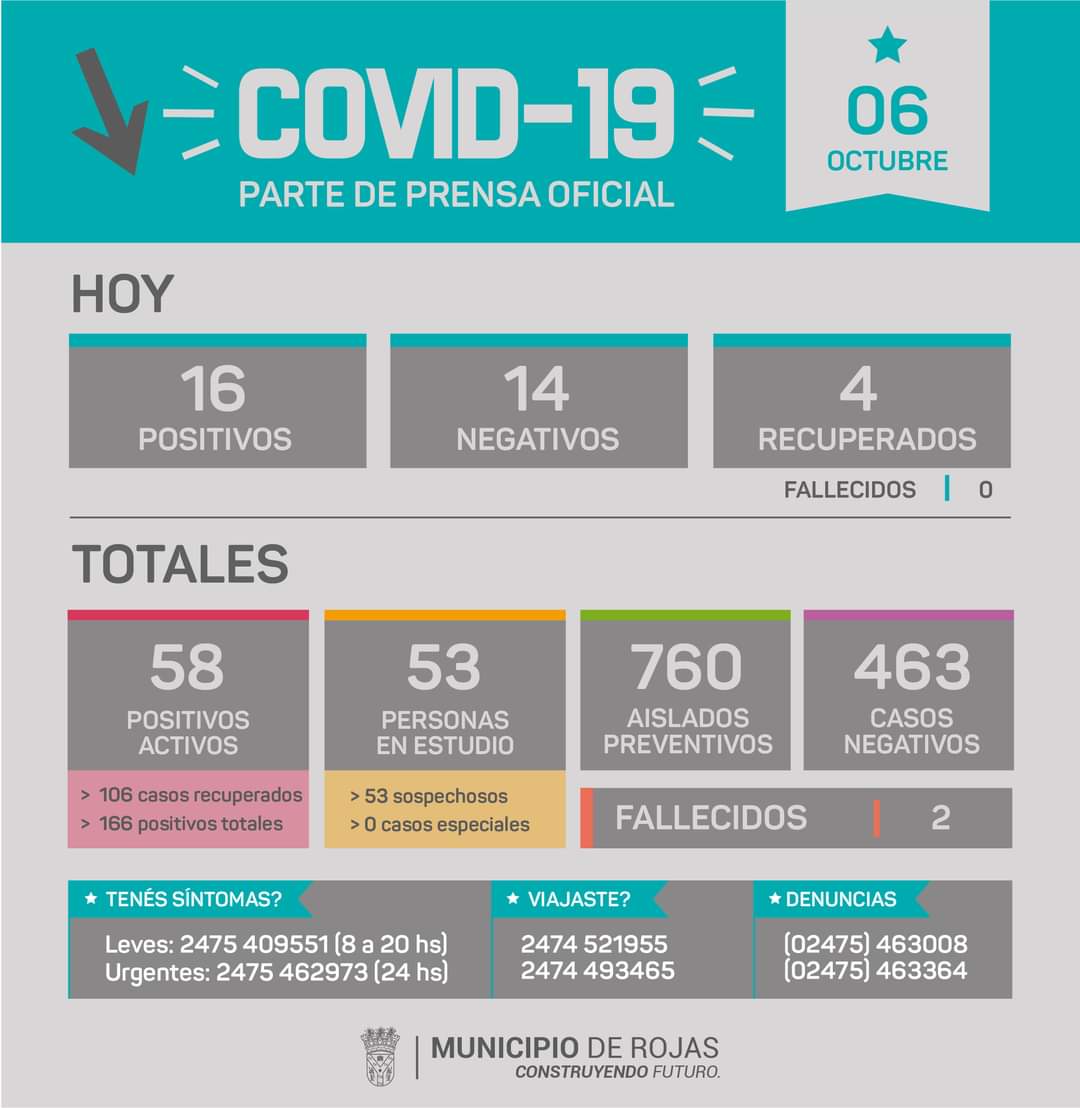 La Secretaría de Salud del Municipio de Rojas informa que en el día de hoy 16 pacientes dieron positivo para COVID-19.