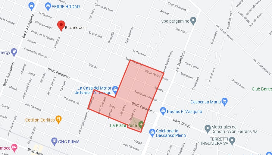 Ramón Raimundo a Bv. Paraguay entre Roque Saenz Peña y Sarmiento, de Bv. Paraguay a Ricardo Jhon entre Roque Saenz Peña y Laprida.