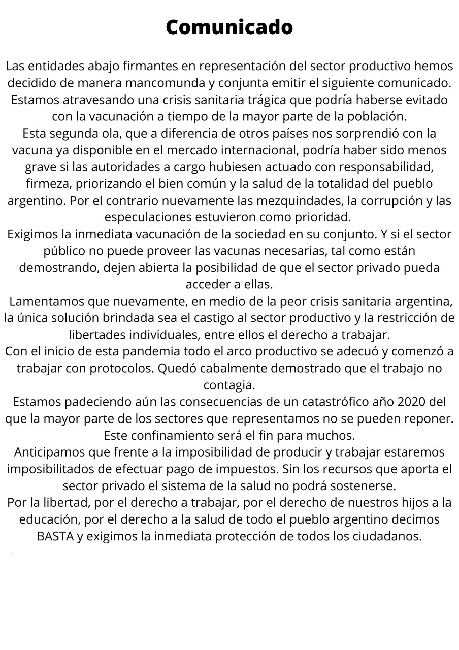 En un comunicado emitido por diferentes cámaras empresariales, representantes de comercios, entidades rurales y cámaras de productores de diferentes localidades, en el cual piden por la agilización del plan de vacunación.