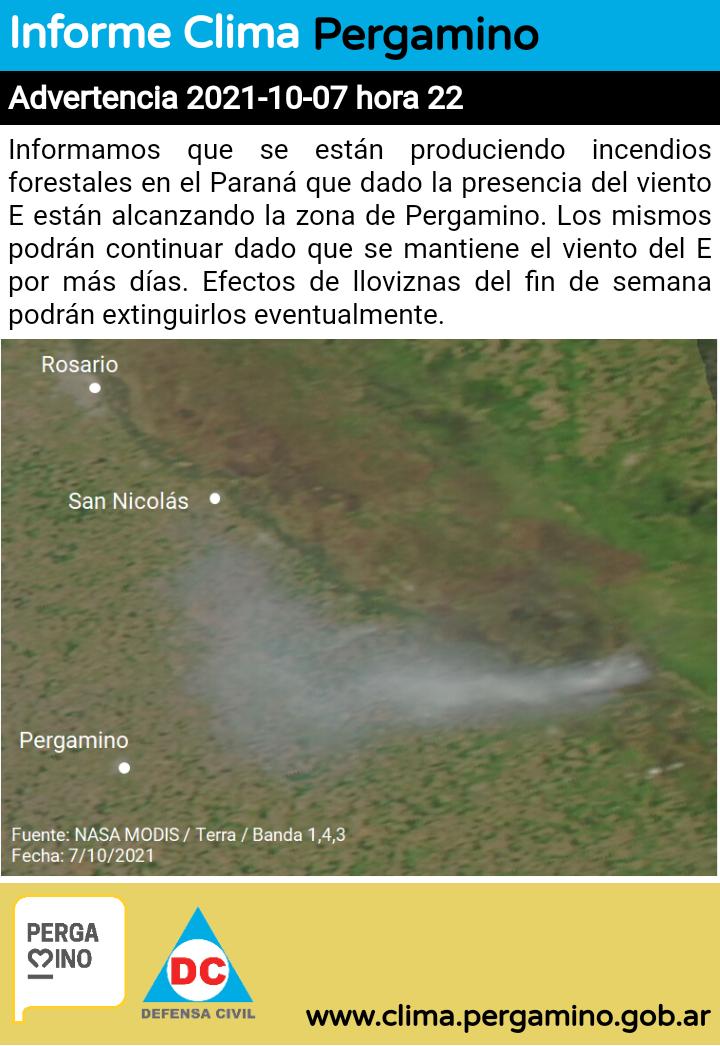 Según reportan desde Defensa Civil, el viento del Este que provocan que el humo llegué a la ciudad continuará durante los próximos días, aunque la posibilidad de lloviznas en la zona del incendio atenuarían el fenómeno.