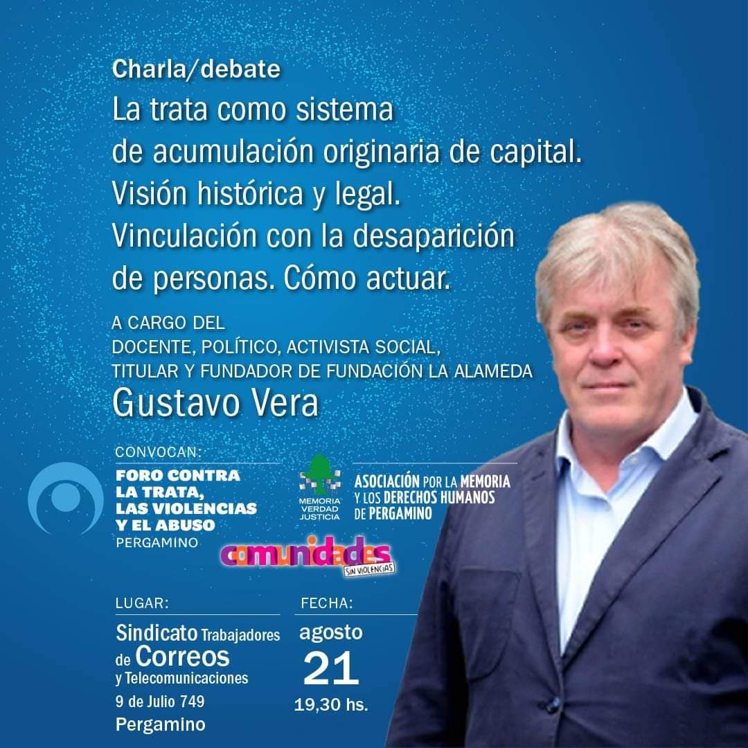 El reconocido activista social, político y docente, Gustavo Vera, titular de la Fundación La Alameda, brindará mañana una charla en el Sindicato de Correos de Pergamino, organizada por el Foro Pergamino contra la Trata, las Violencias y el Abuso. La disertación, titulada «La trata como sistema de acumulación originaria de capital: visión histórica y legal, vinculación con la desaparición de personas, cómo actuar», será abierta al público con entrada libre y gratuita a las 19:30 horas.