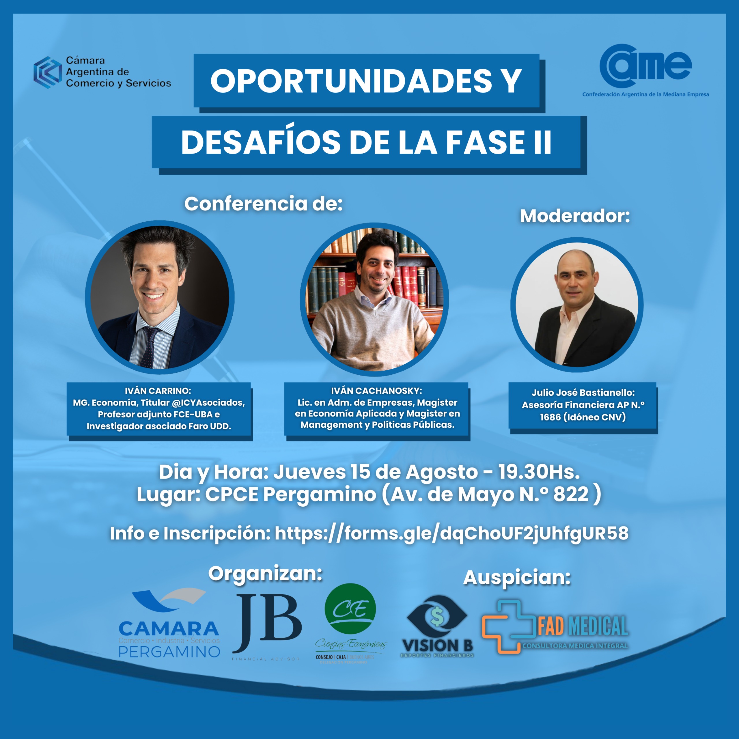 El próximo jueves 15 de agosto, a las 19:30 horas, el Consejo Profesional de Ciencias Económicas de Pergamino será el escenario de una charla sobre la situación económica actual de Argentina, titulada «Oportunidades y Desafíos en la Fase 2». La actividad, que promete convocar a un nutrido grupo de interesados, contará con la participación de dos reconocidos economistas: Iván Kachanosky e Iván Carrino.