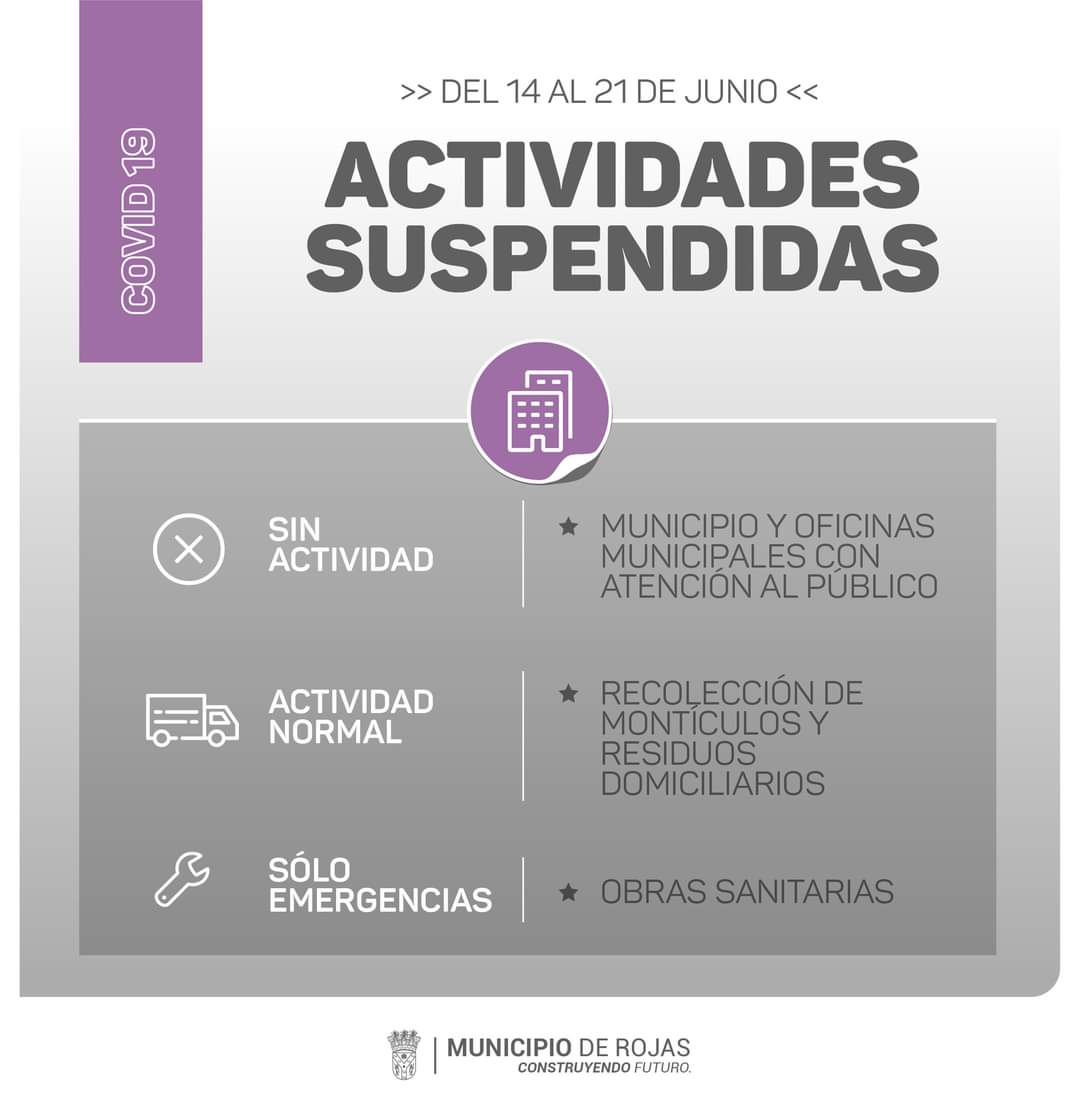 El Municipio de Rojas,. informó que desde hoy, y por una semana, el municipio modifica sus actividades para reducir la circulación de personas en el ámbito del palacio municipal y las dependencias municipales con atención al público.